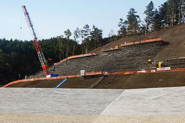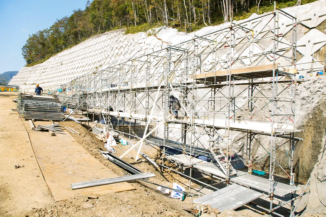 道路や住宅地を整備する際にできる人工的な斜面を「法面(のりめん)」といいます。これらは自然にできた斜面ではないため、風化や浸食で土砂崩れが起こりやすくなります。そこで、法面の安全性を長年にわたって確保するために、法枠工・アンカー工・モルタル吹き付けなどを行なうのが法面工事の主な作業内容です。