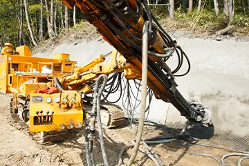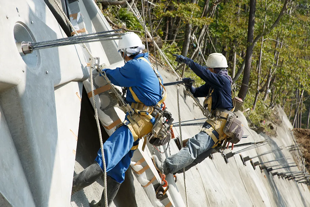 地中にグラウトによって造成する定着部と地表付近の構造物を、高強度の引張材で連結させ、引張力を利用して安定させる作業を「グラウンドアンカー工事」といいます。法面にボーリングマシーンで孔をあけて滑りを防止していくような工事です。